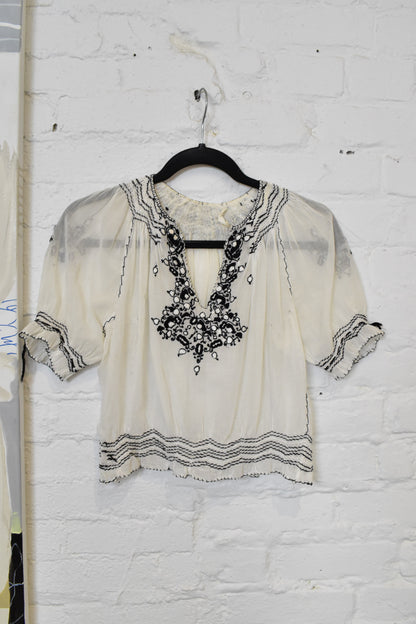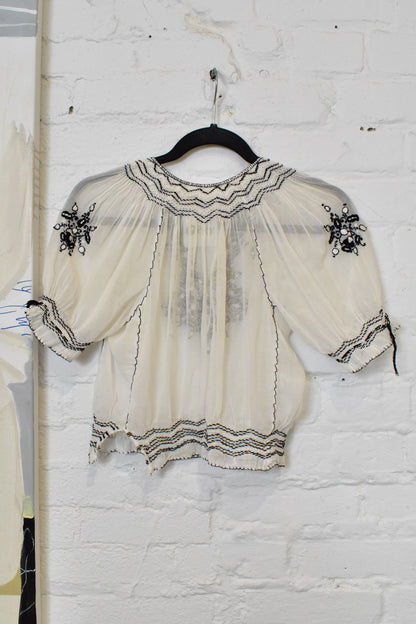 Vintage 1940s White Gauzy Cotton Peasant Blouse. Black and White Embroidery. Snap Closure at Side Waist. Sheer.