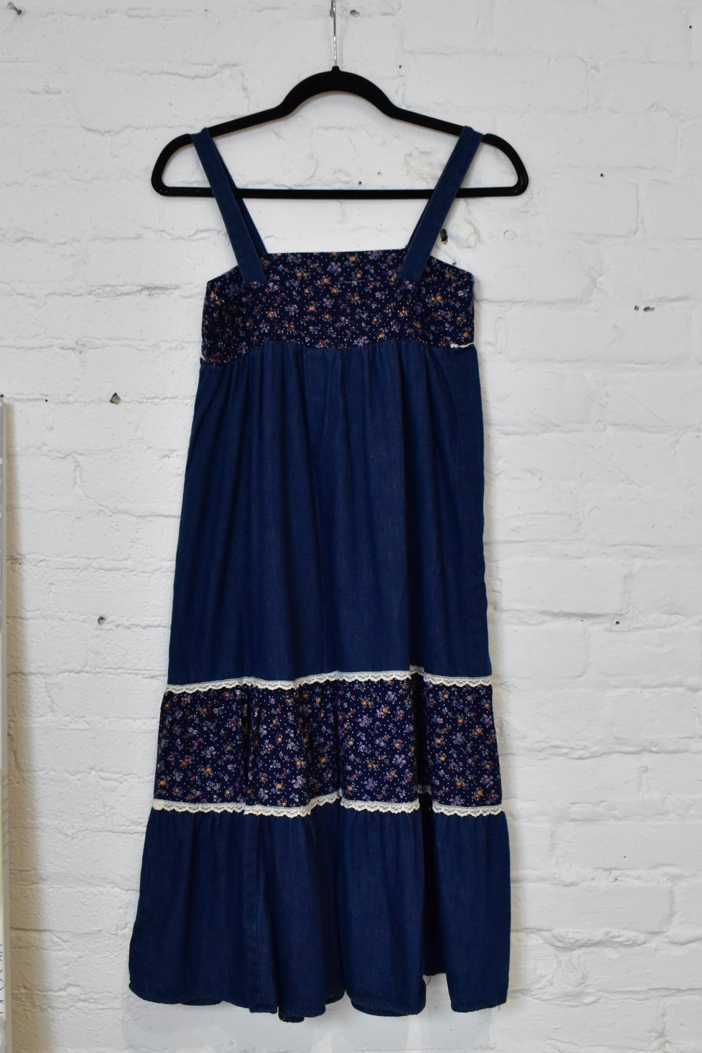 Vintage 1970s "Eber" Denim and Floral Dress. Lace Trim. Elasticized Along Back. No Closures.