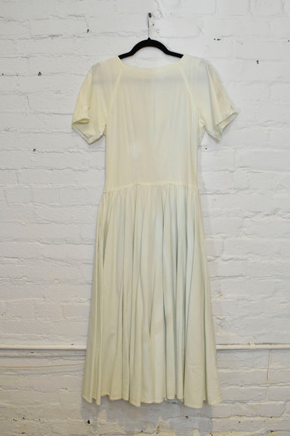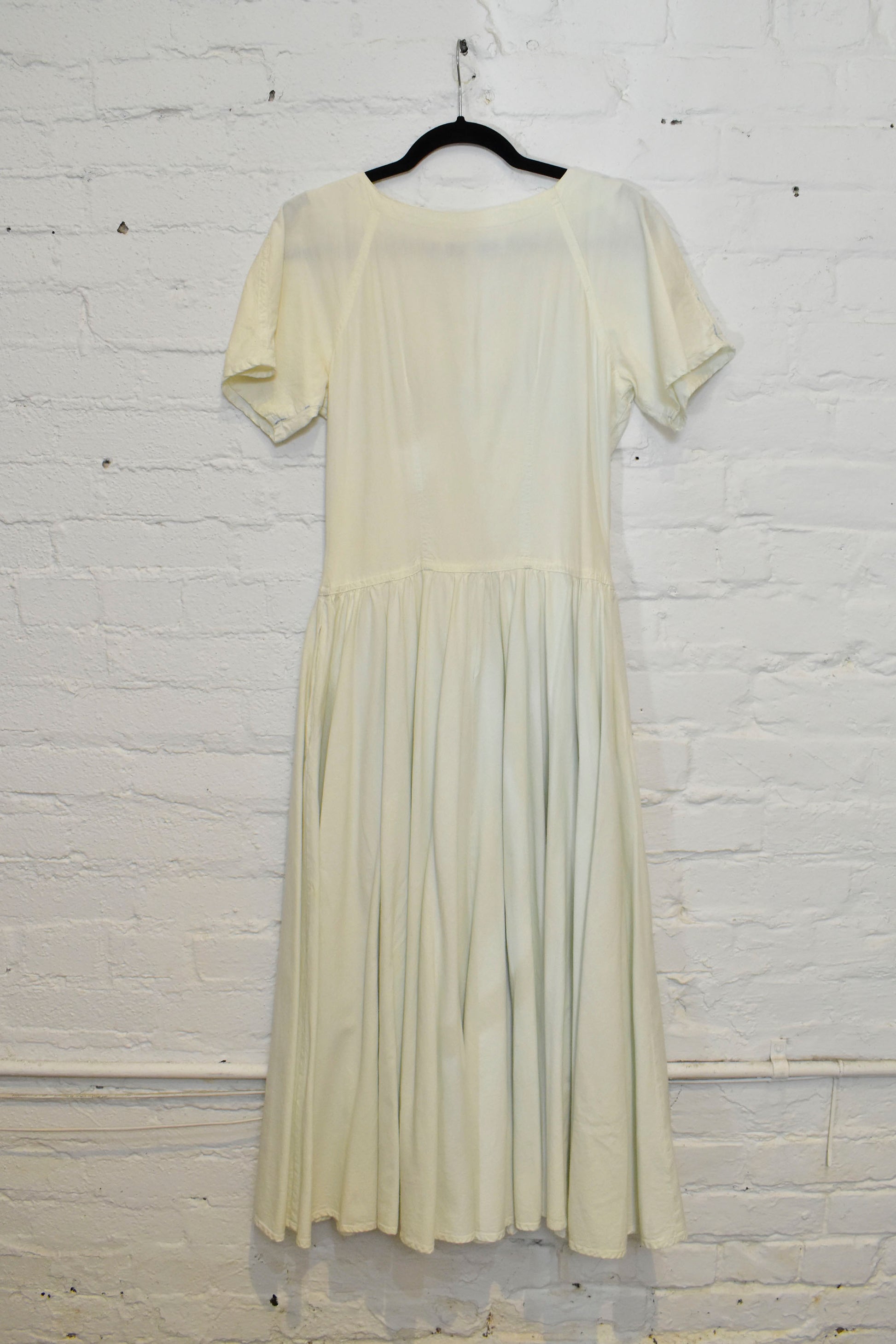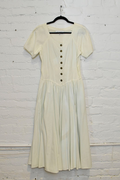 Vintage 1980s "Ashlee California" White Cotton Dress.Unlined. Short Sleeve. Two Pockets. Button Closure. Uncollared.