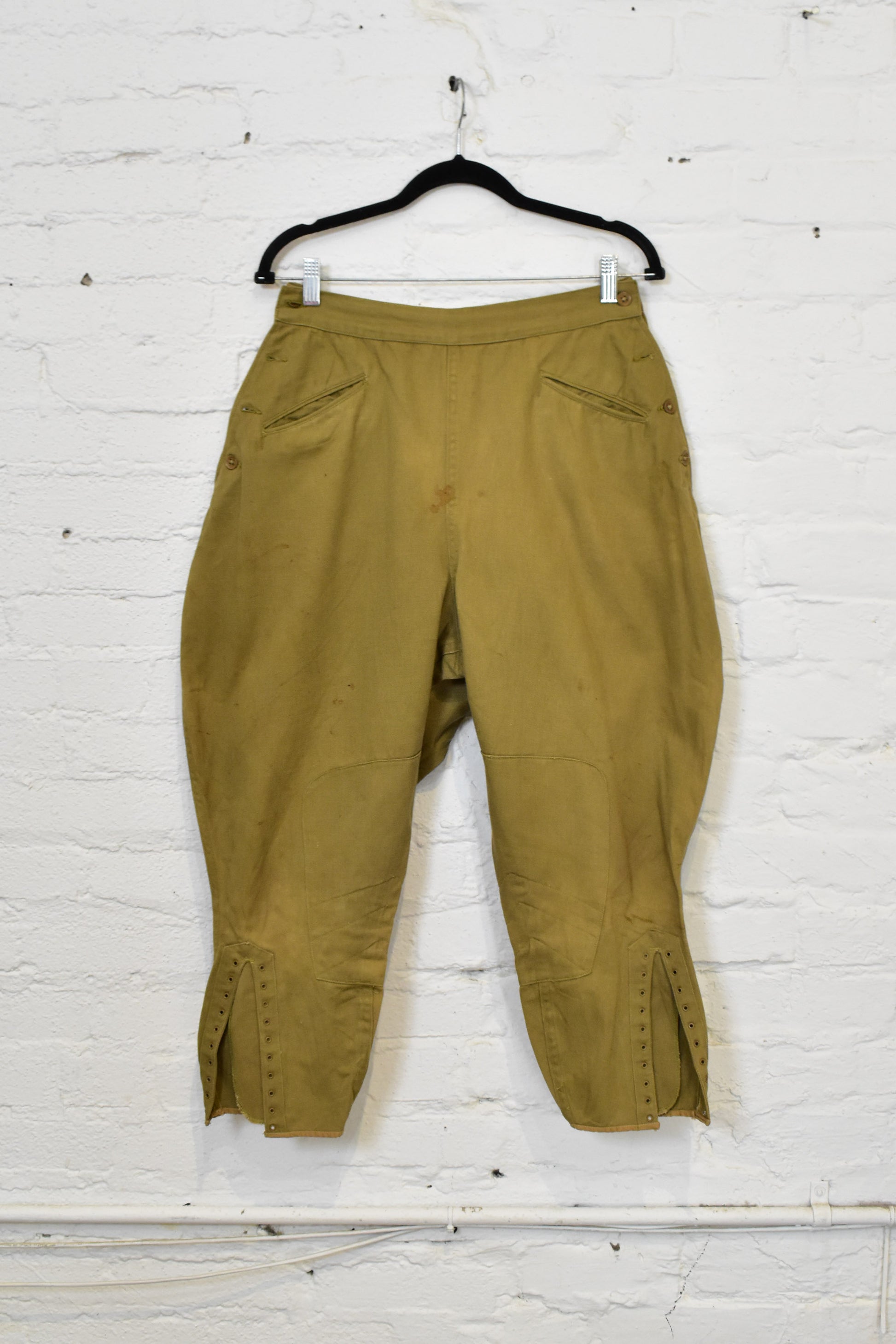 Vintage Olive Khaki Jodhpur Riding Pants. Side Button Closures. Two Hip Pockets. Union Made. Lacing Pants (Lacing needs to be replaced).
