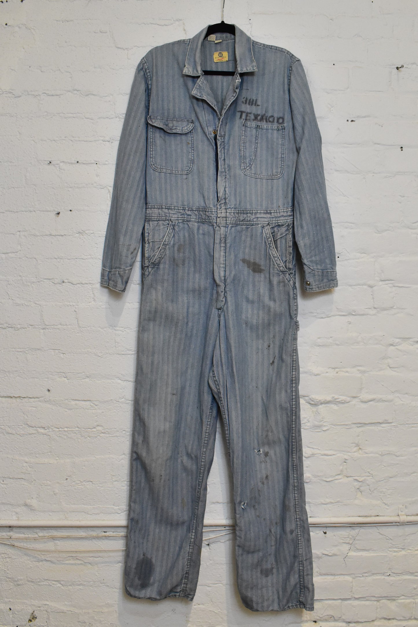 Vintage 1960s Big Ben by Wrangler Coveralls. Blue Herringbone Pattern. Talon Zipper Closure. Multi-Pockets. Straight Leg. Hand Drawn/Stencil "TEXACO" Front and Back.