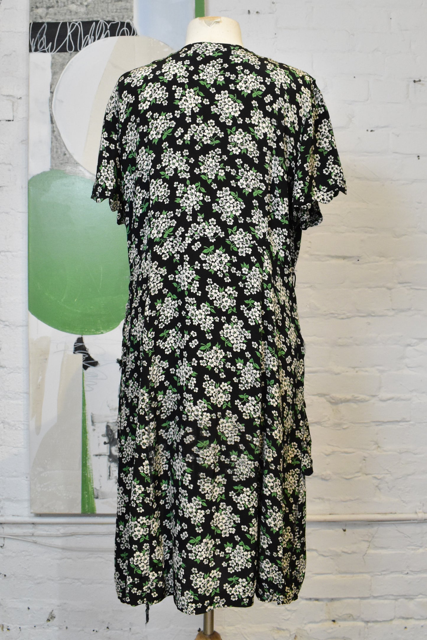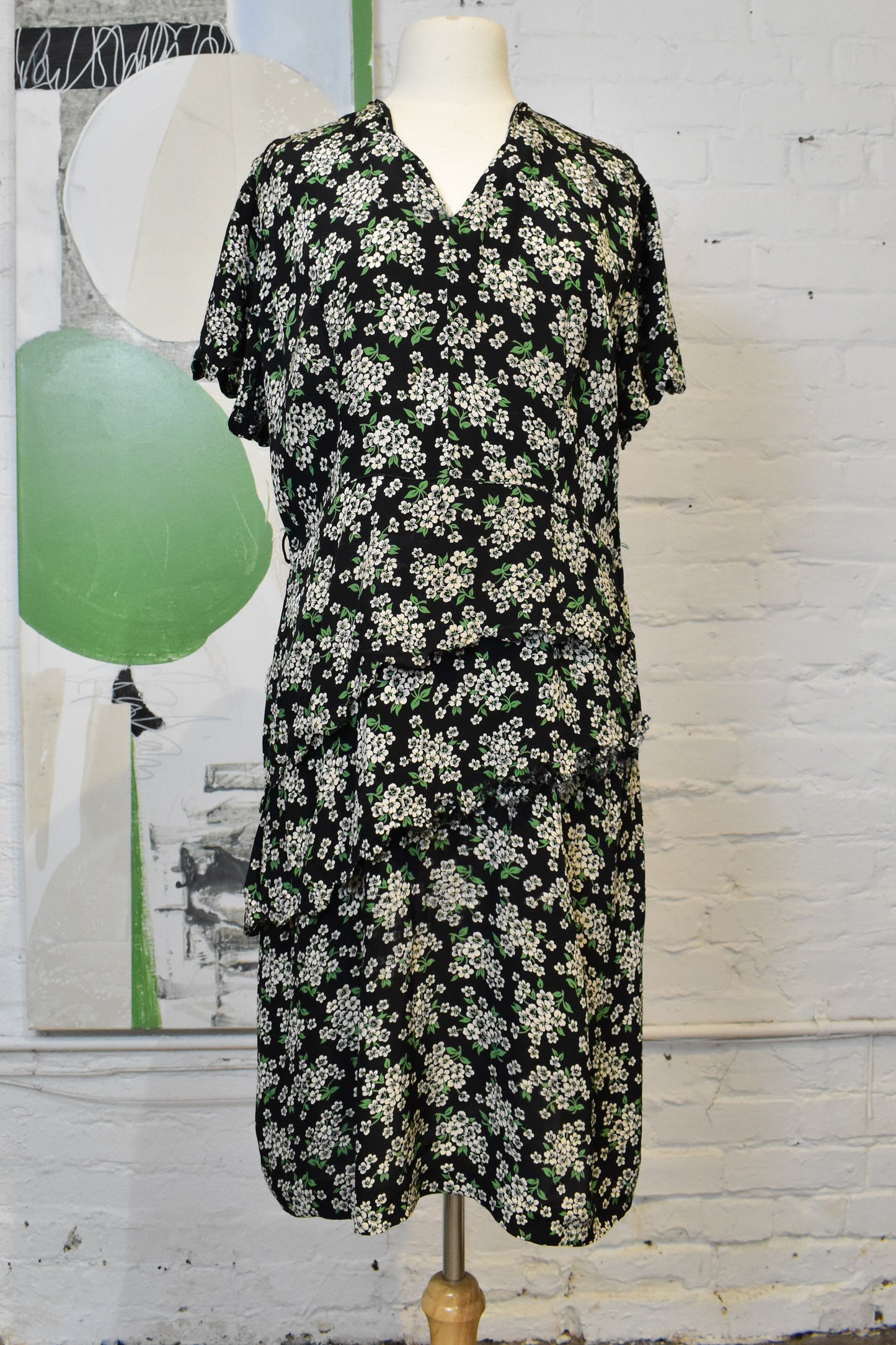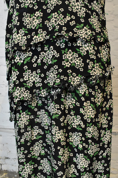 Vintage 1940s Black Floral Rayon Tiered Midi Dress