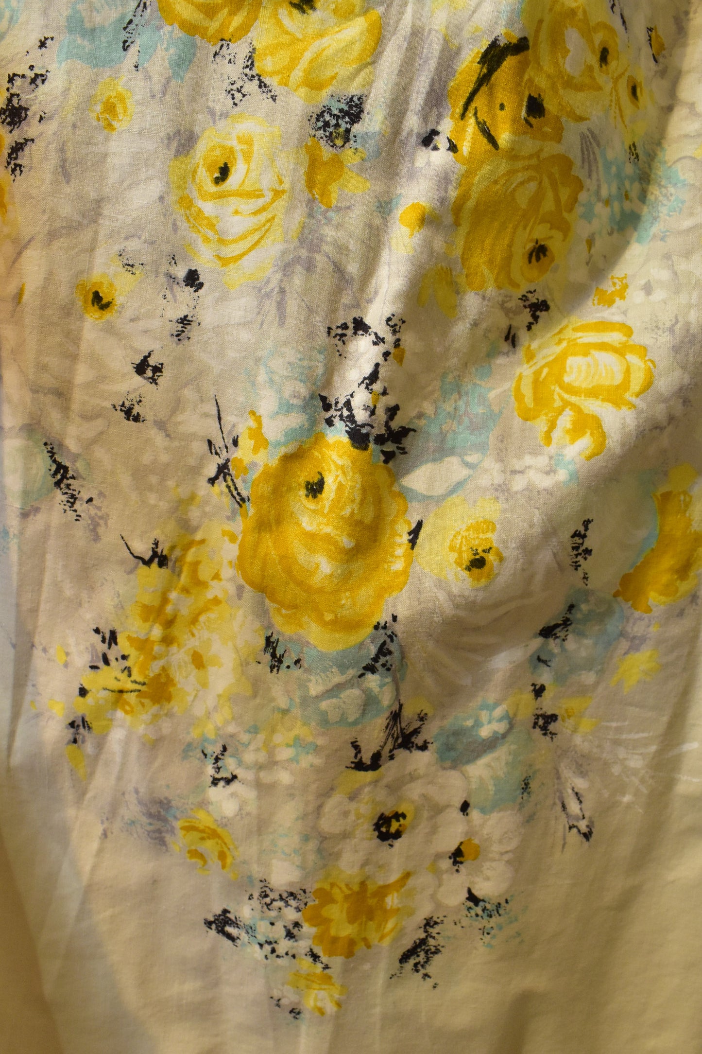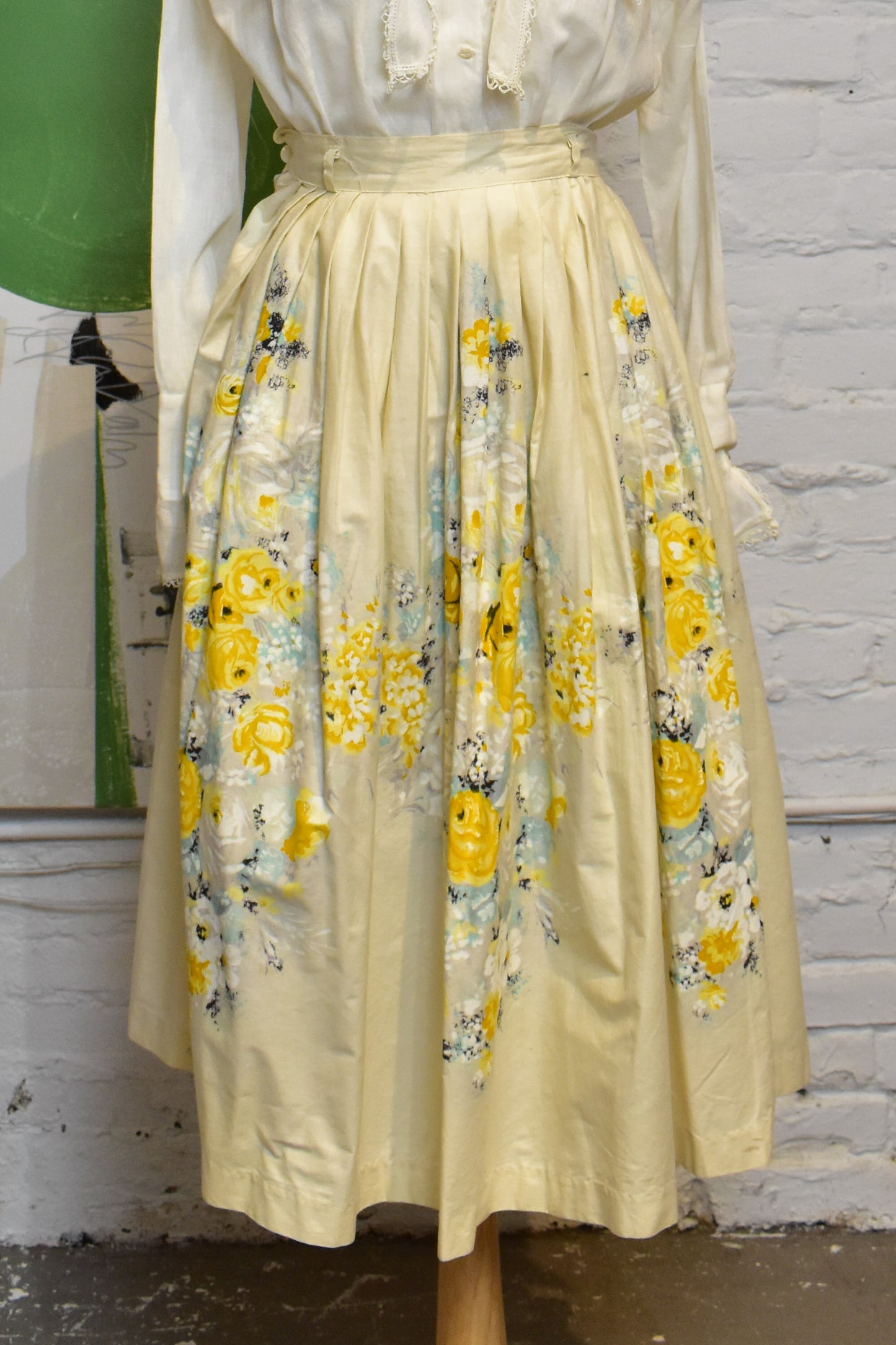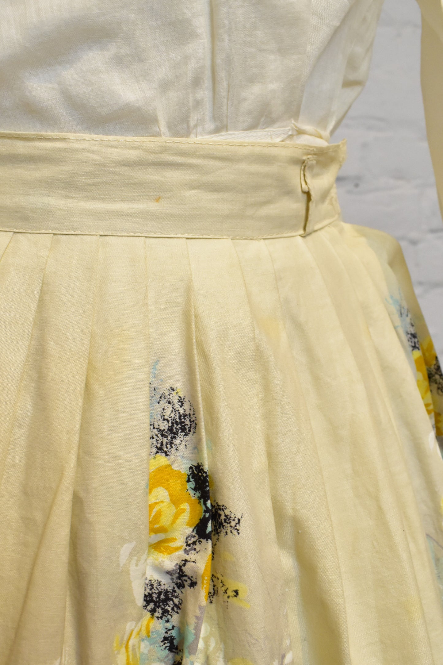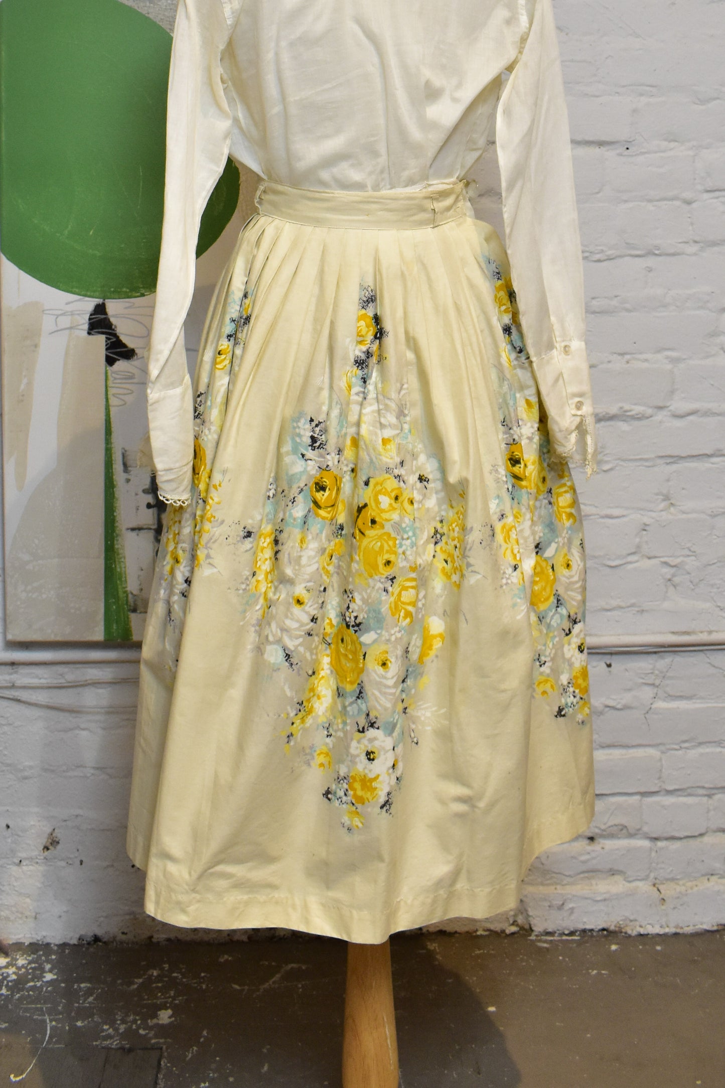 Vintage 1950's/1960's Cream Cotton Skirt. Blue and Yellow Floral Pattern. Side Button/Zipper Closure. Belt Loops. Unlined.