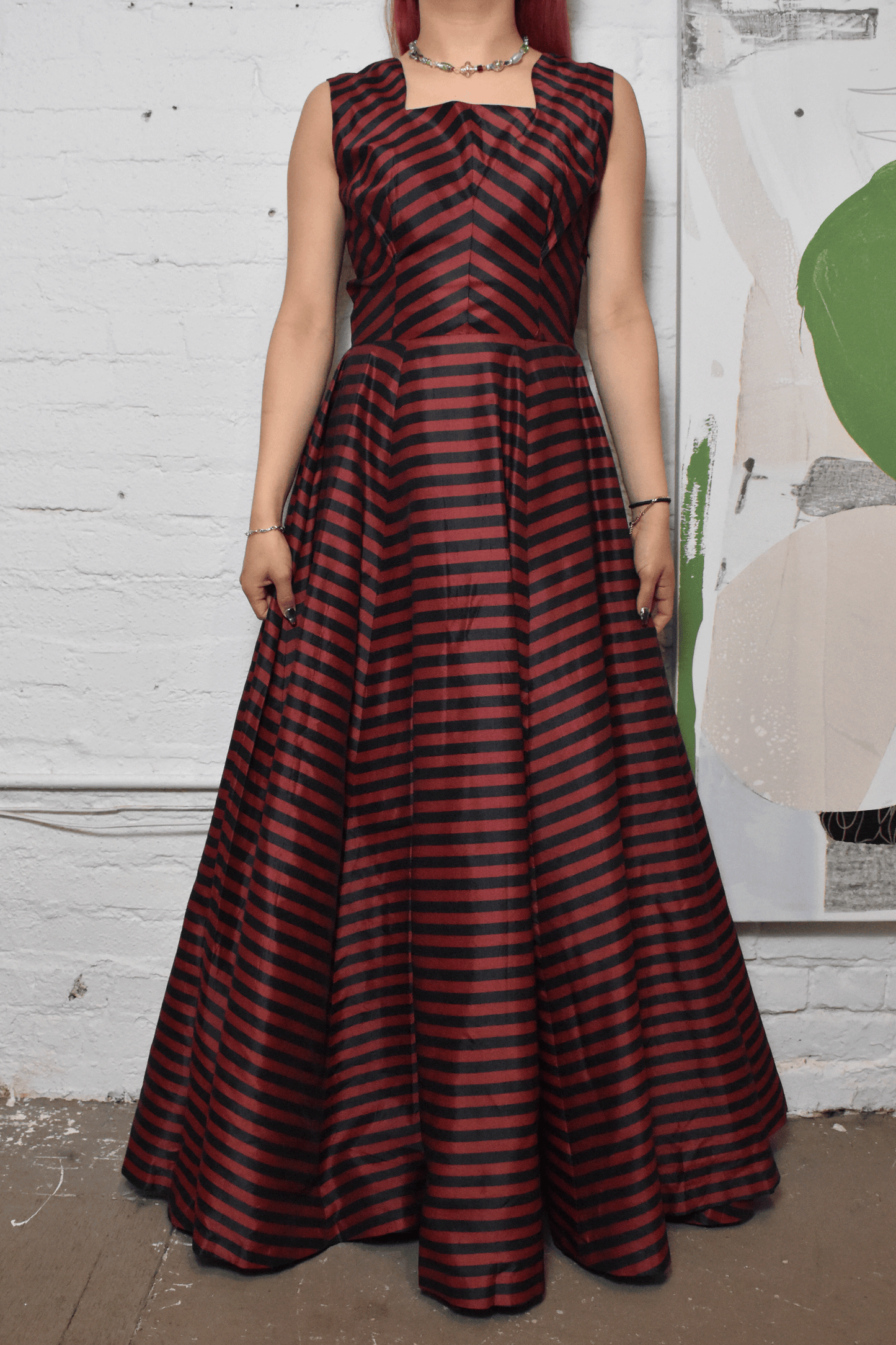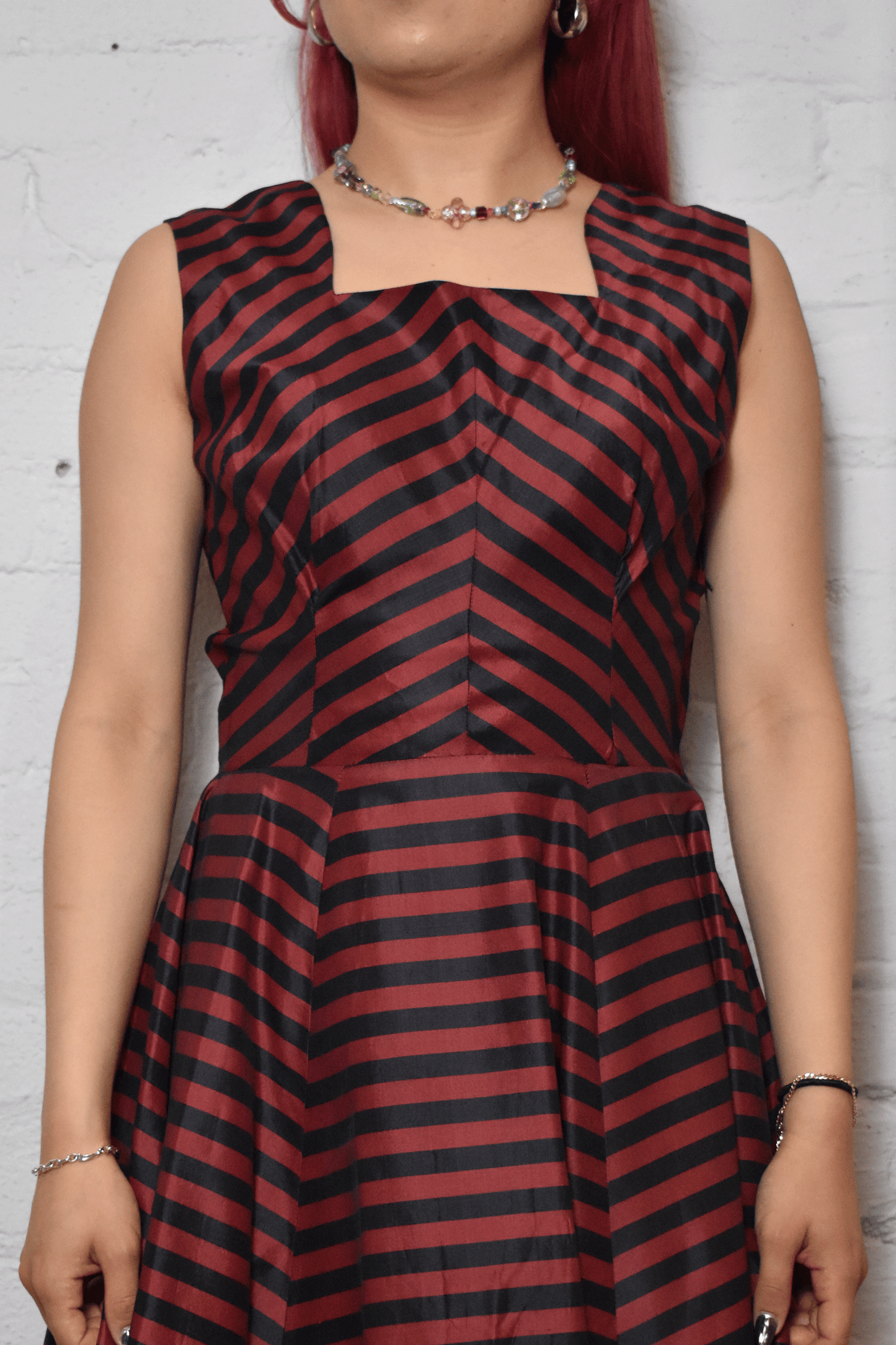 Vintage 1950s Stripped Wine and Navy Dress. Unlined, sleeveless, talon zipper, darted chest, square neckline, fitted waist and A-line skirt.