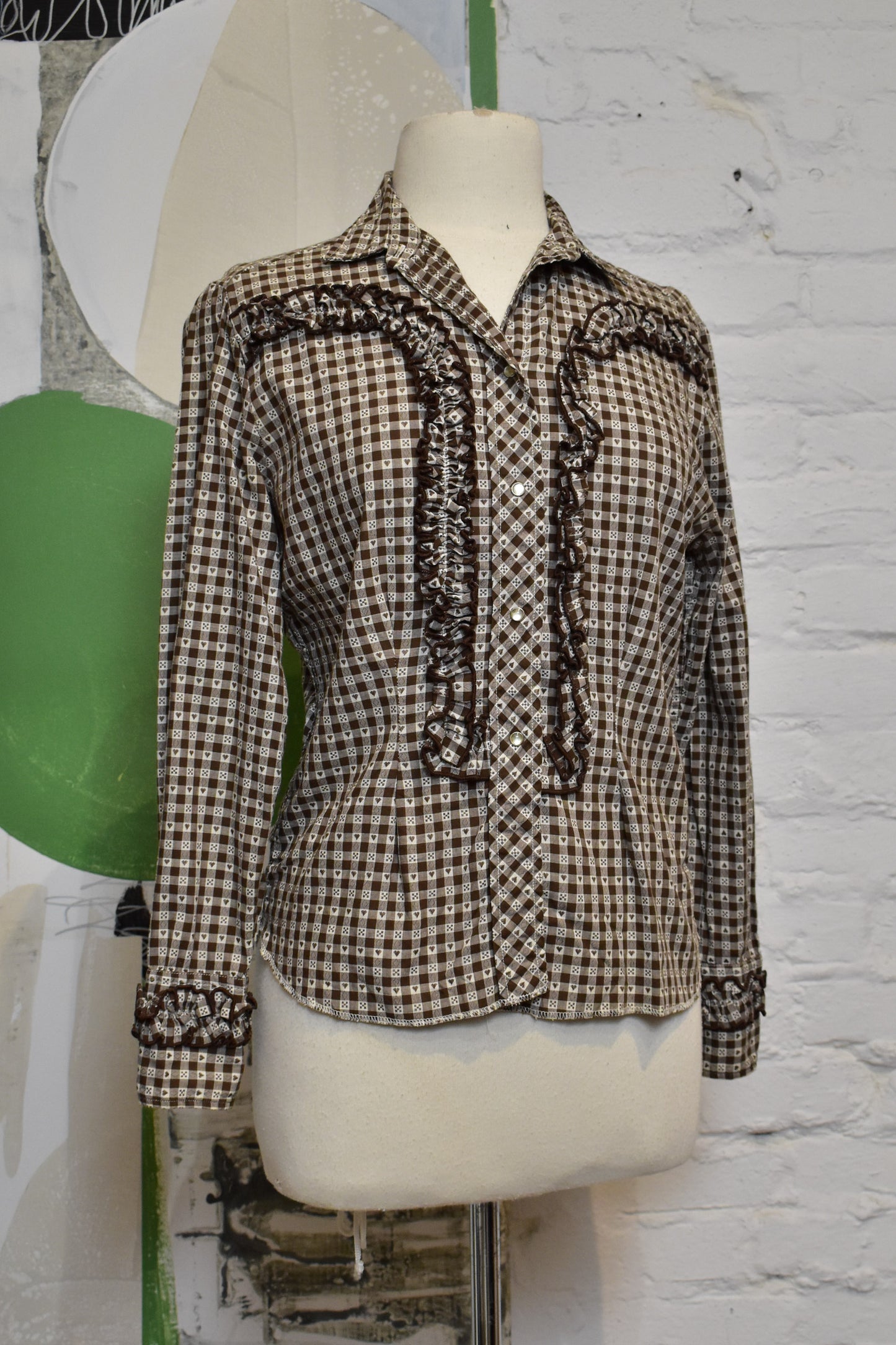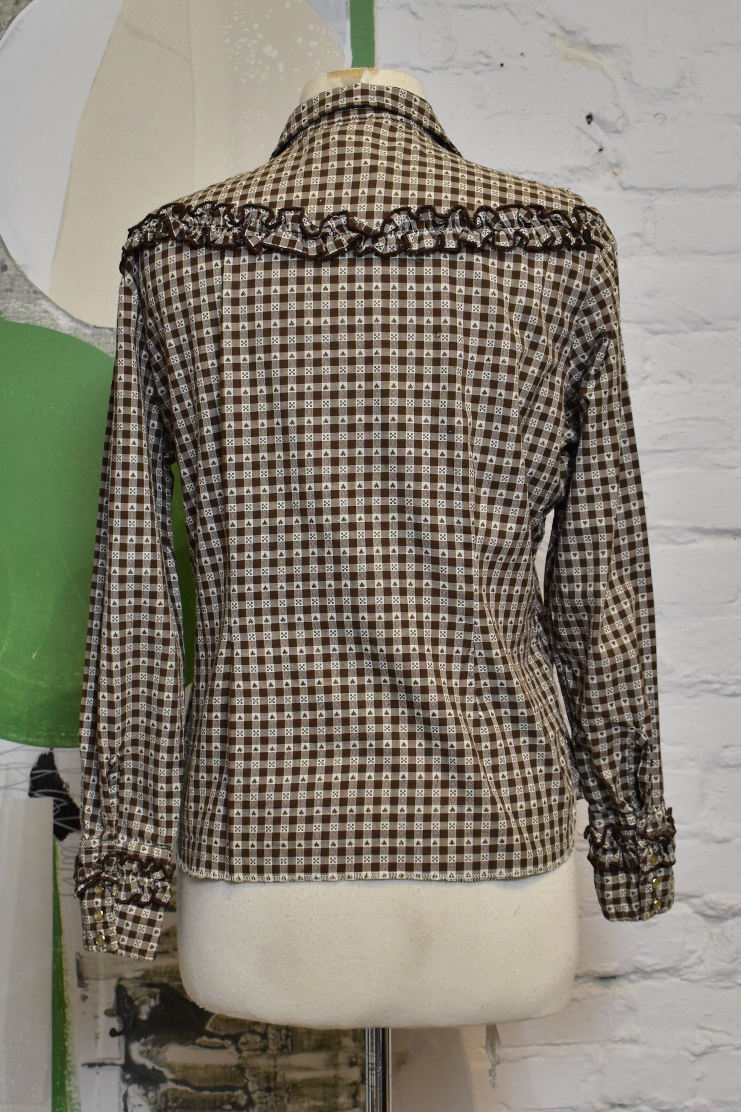 Vintage "LEVIS" Western Wear Blouse. Ruffle Chest and Sleeve Detail. Novelty Heart Pattern Gingham. Pearl Snap Closure. Dan River Fabric. Darted Waist.