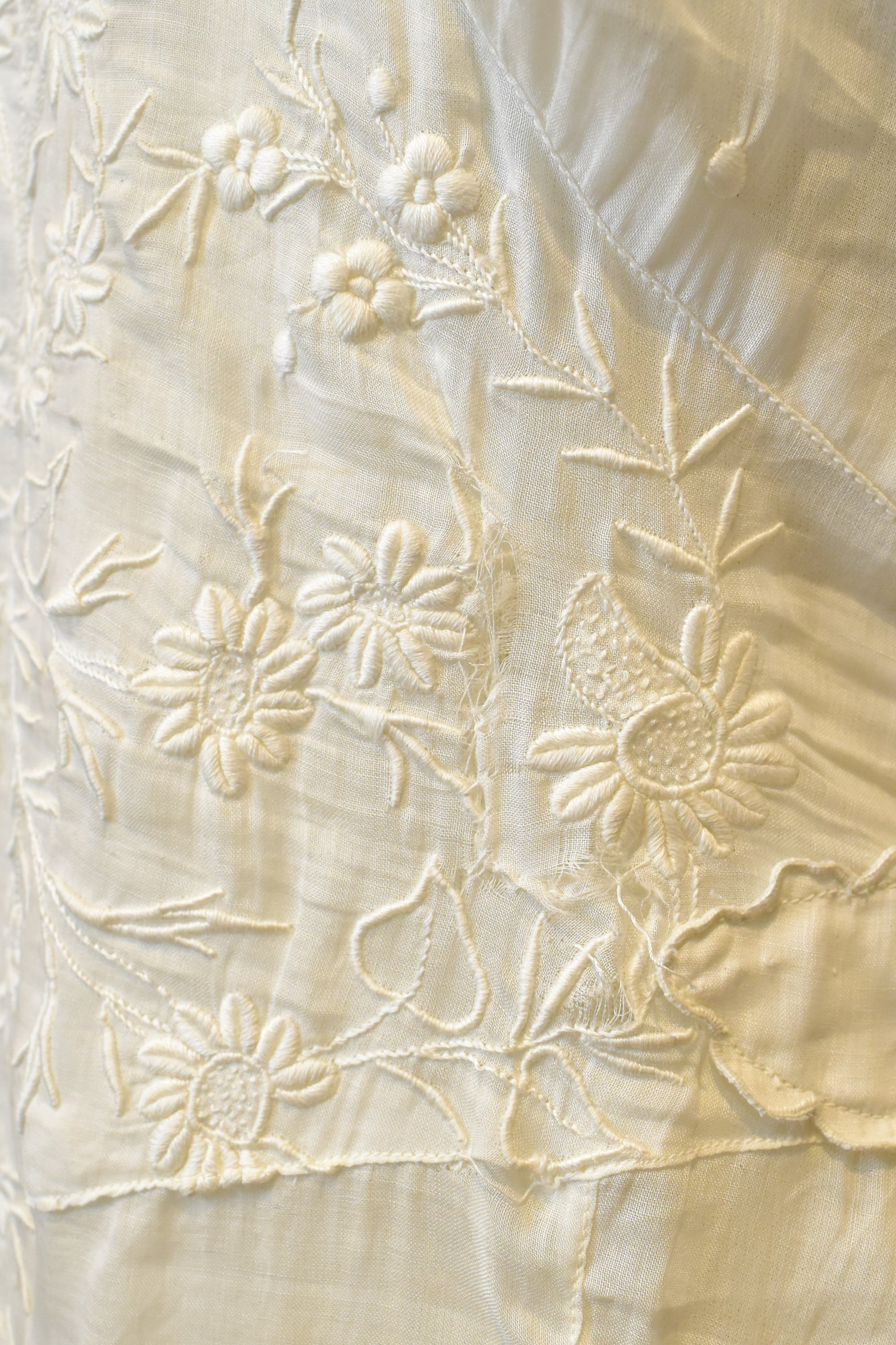 1910s Edwardian Embroidered Lace Dress. Delicate floral embroidery throughout. Sheer with lace trim at collar and cuffs. Half sleeves. Unlined. No Closures.