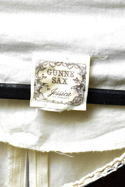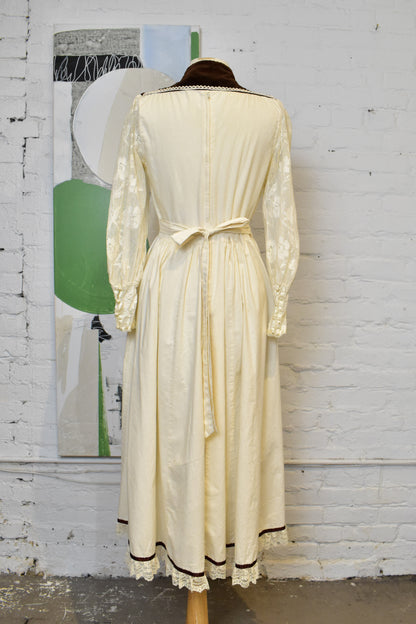 Vintage 1970s "Gunne Sax" Dress. Brown Velvet Bodice with Chest Lacing. Lace Sleeves with Button Wrist Closure. White Cream Skirt with Lace Ruffle Trim. Waist Tie. Zipper Closure Mid Back.