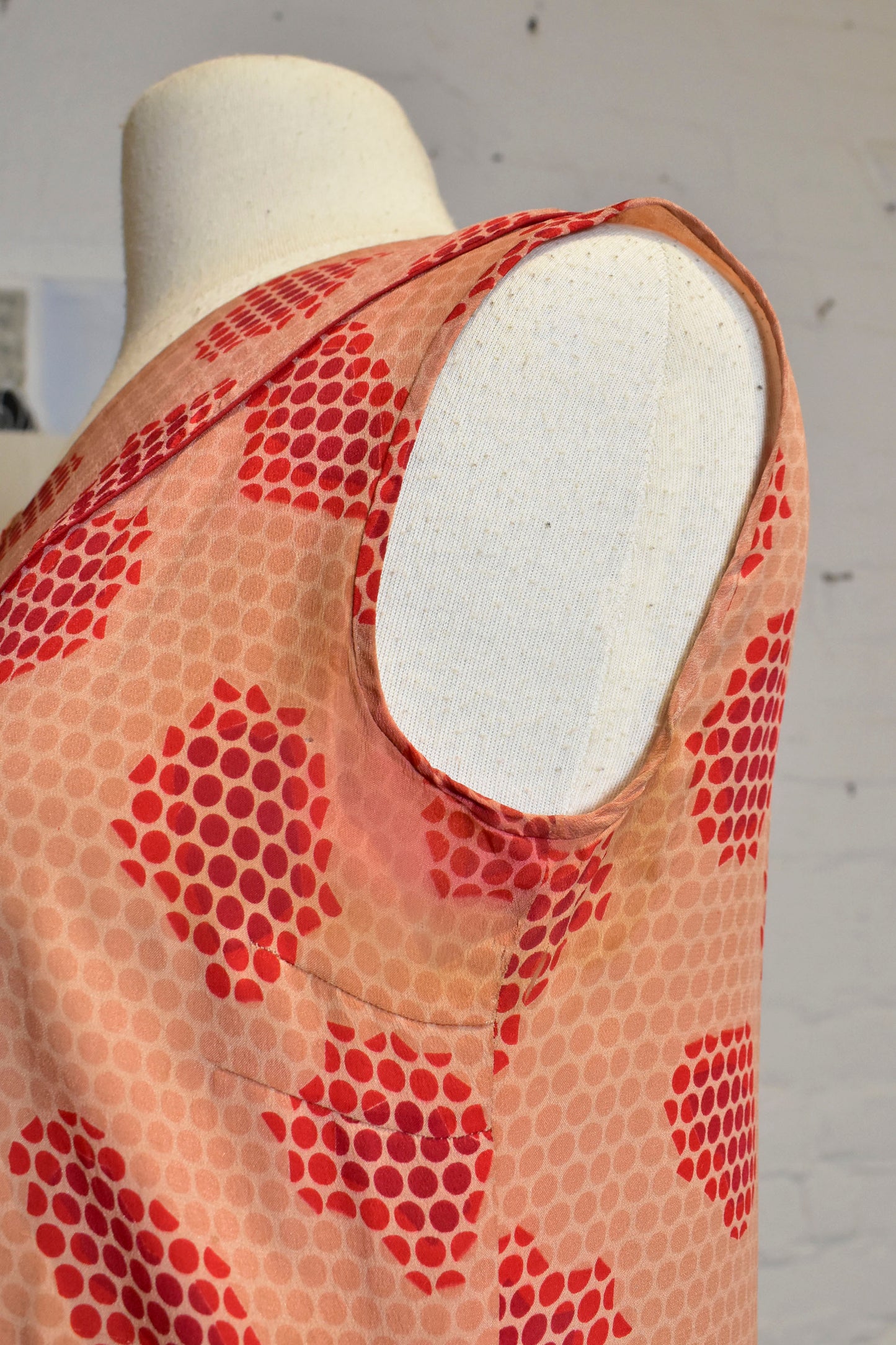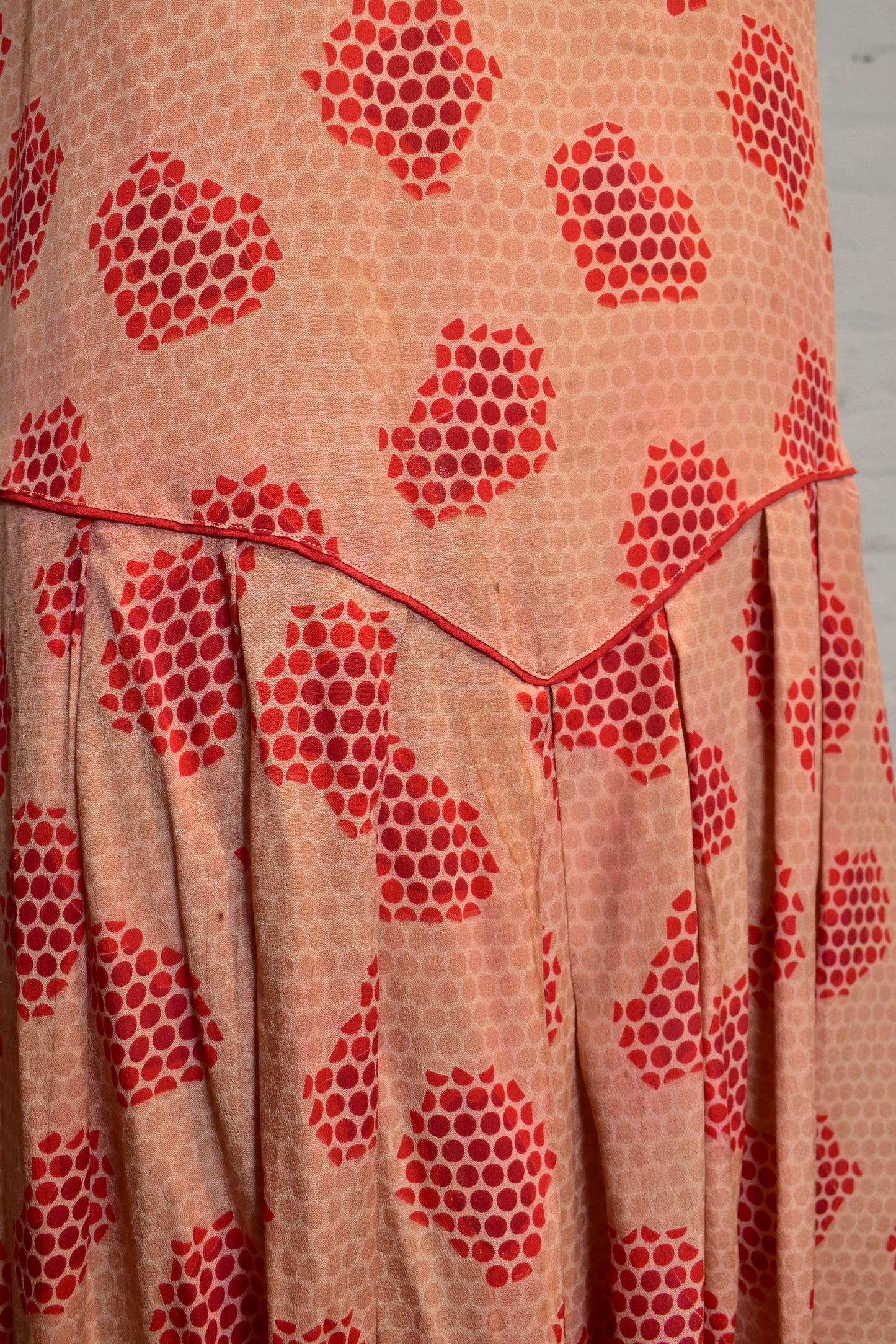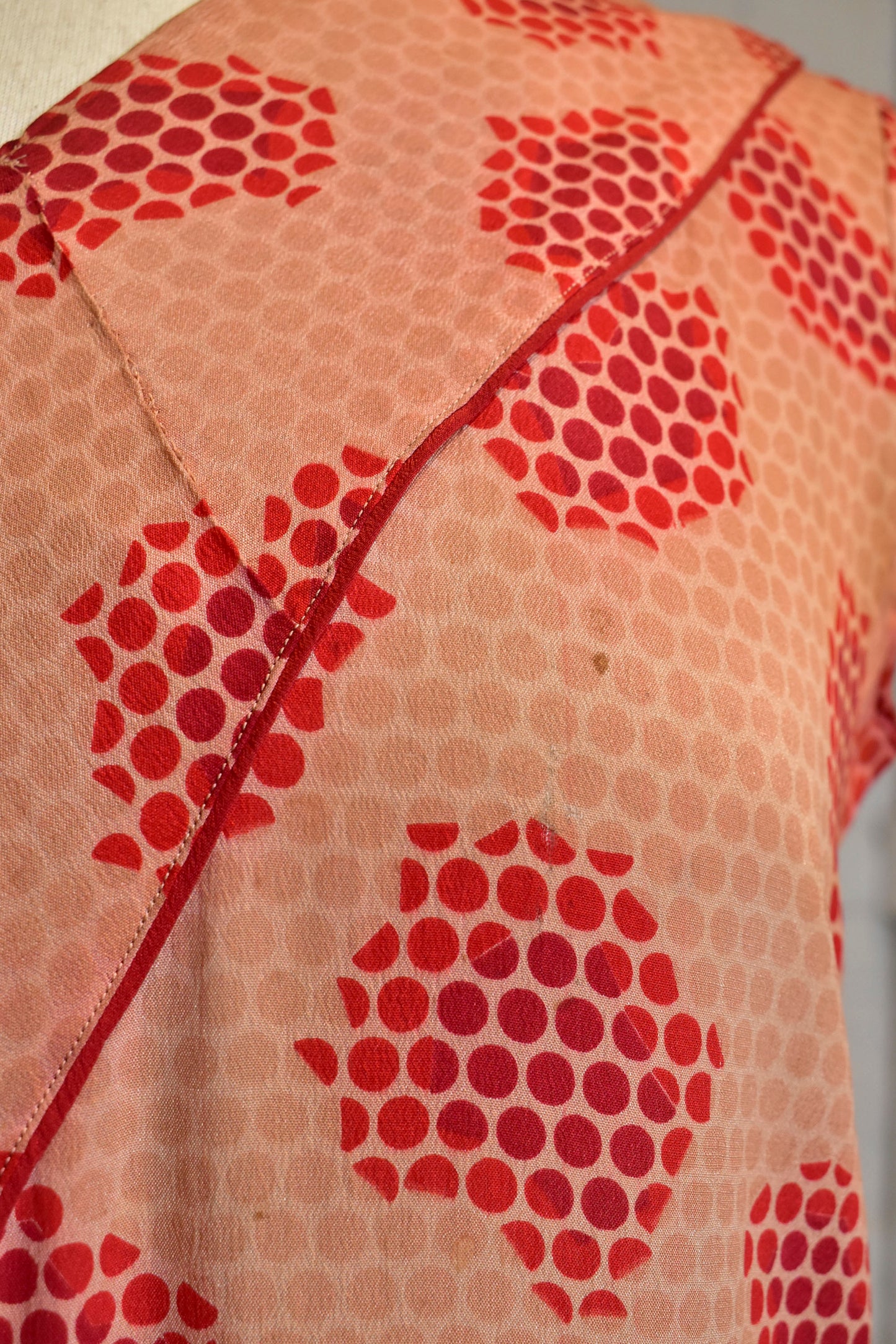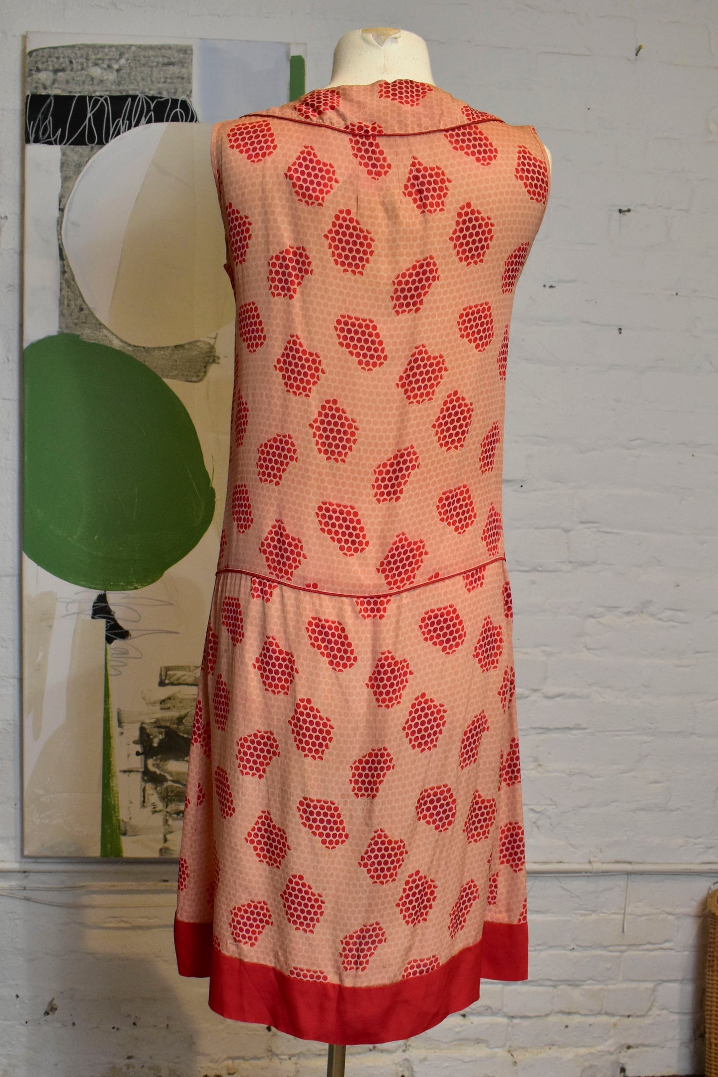 Vintage 1920's Pink and Red Honeycomb Print Silk Dress. V Neckline Detail. Drop Waist. Pleats in Skirt. Unlined. No Closures.