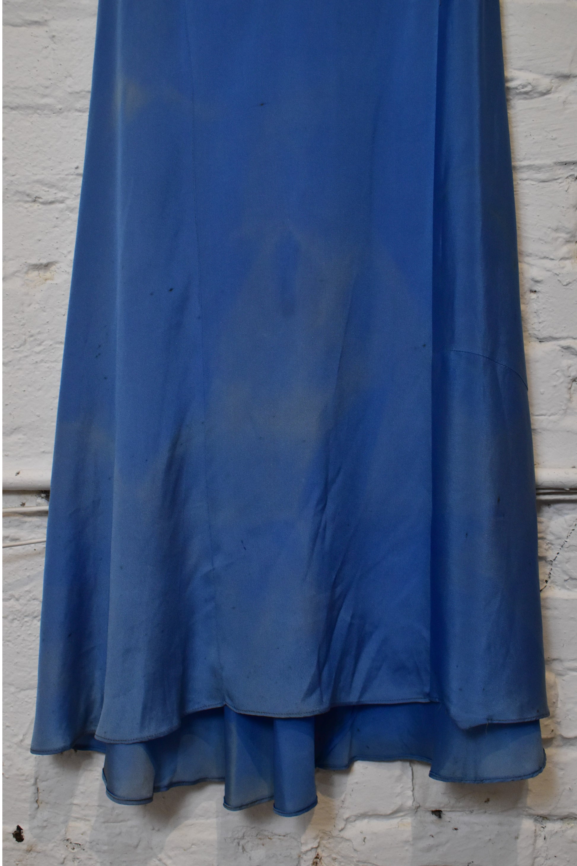 Good/Fair Vintage Condition - Marks present throughout the skirt and back. Small pin holes. Seam coming undone underarm. Strong and wearable - good passion project - make a mini dress?