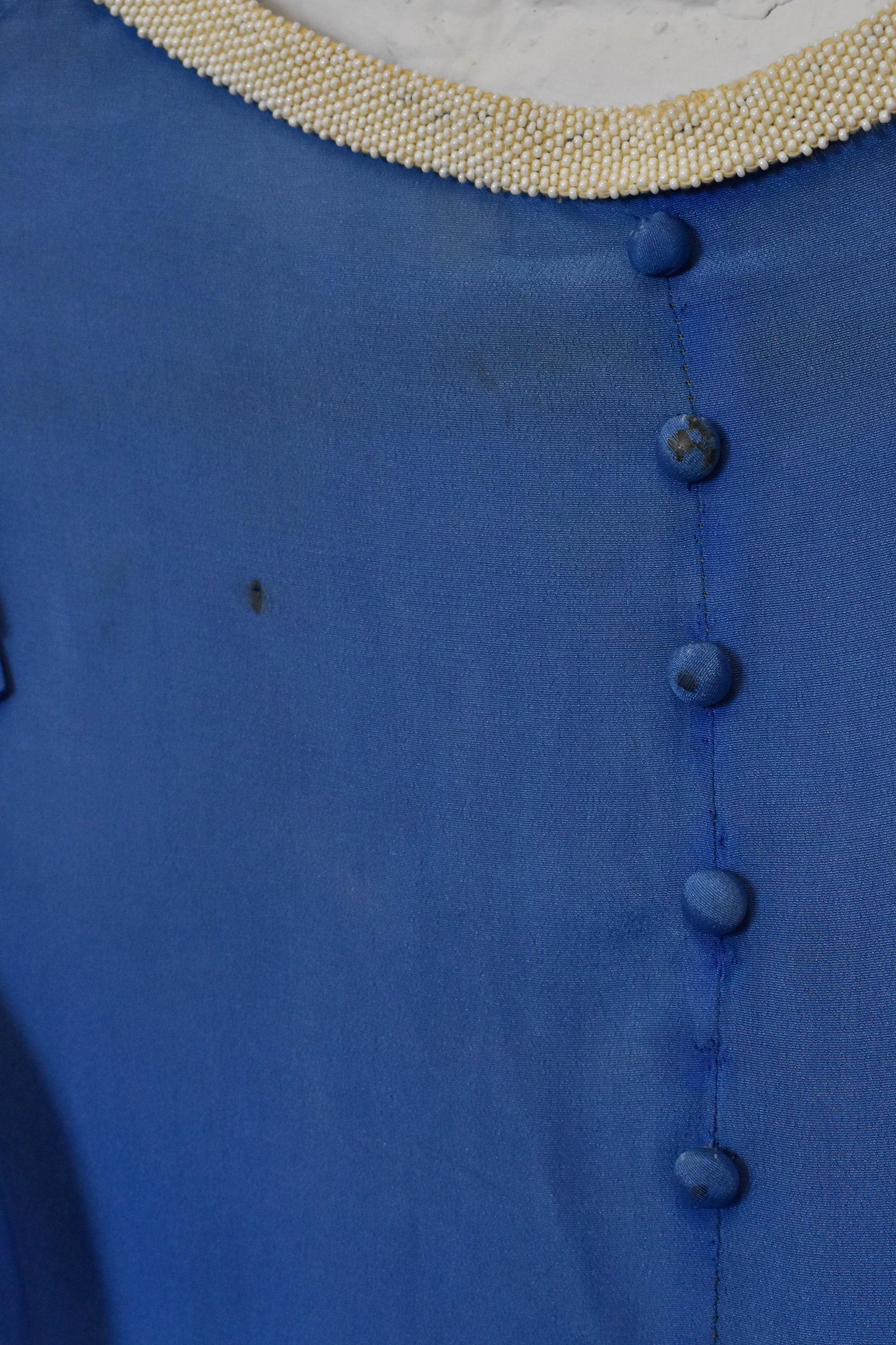 1930s Blue Puff Sleeve Maxi Dress with Beaded Trim.