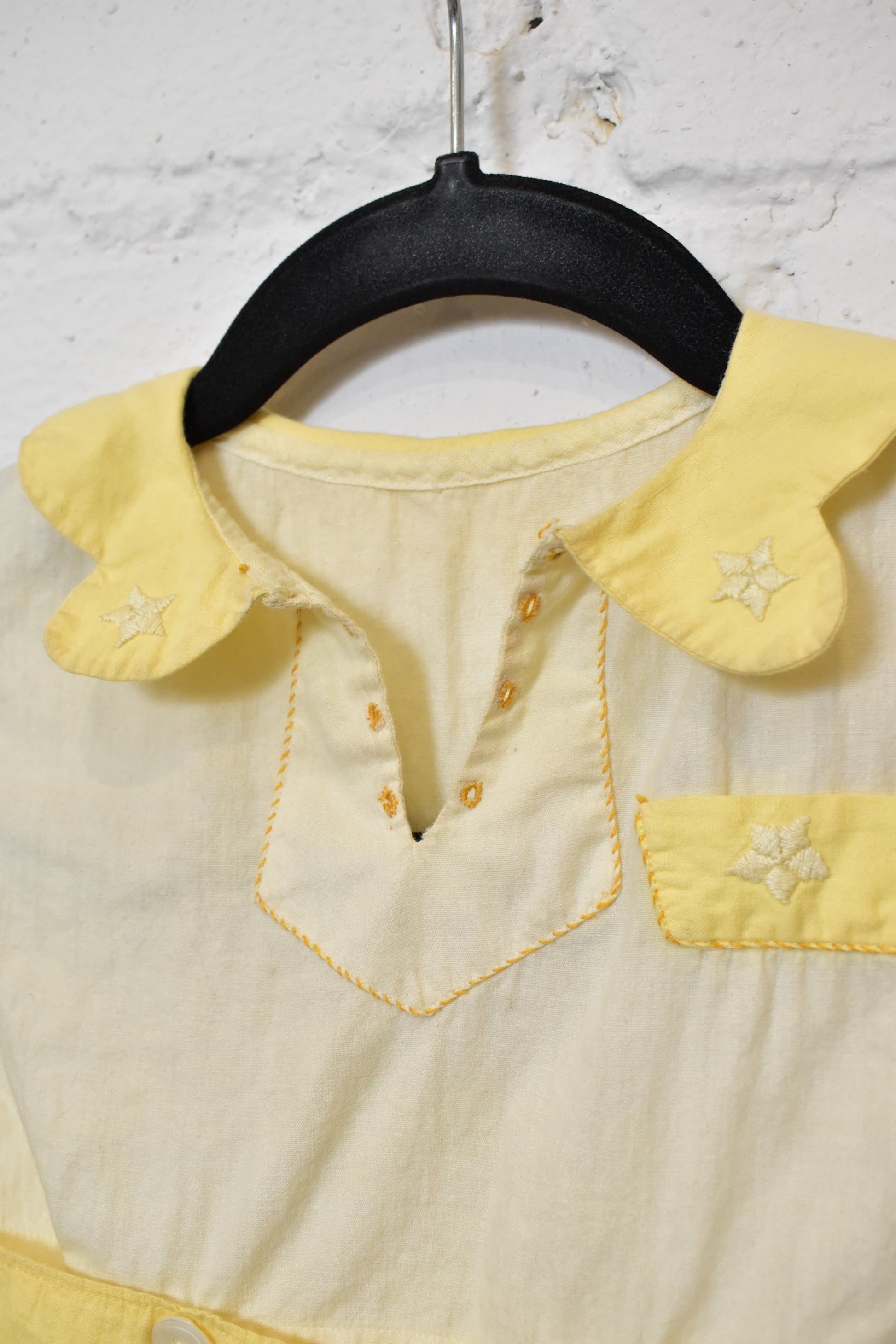 Vintage 1930s Boys Cotton Outfit. White and Yellow Cotton Shirt Buttoned to Shorts. Star Embroidered. Button Closure Crotch for Changing.