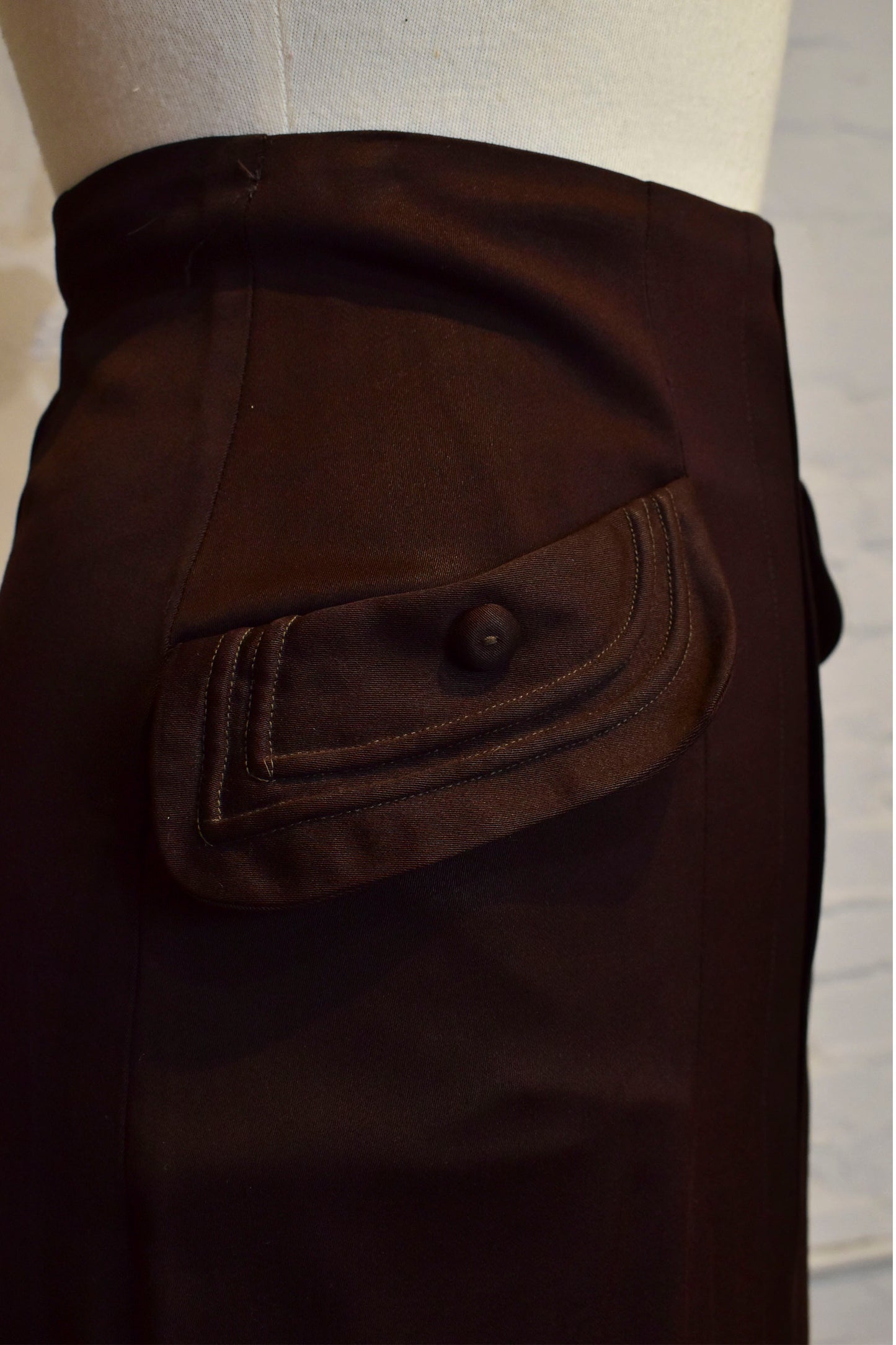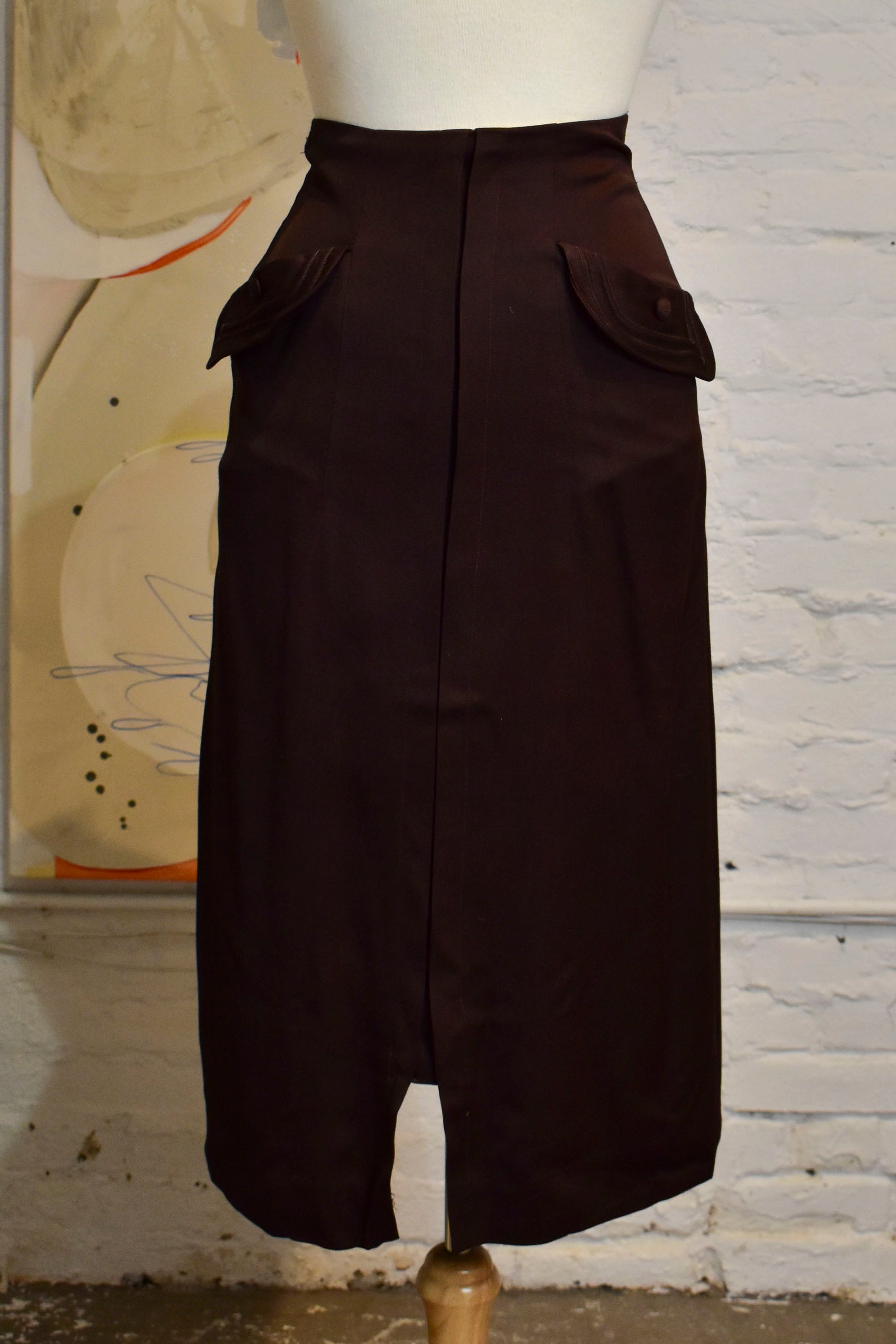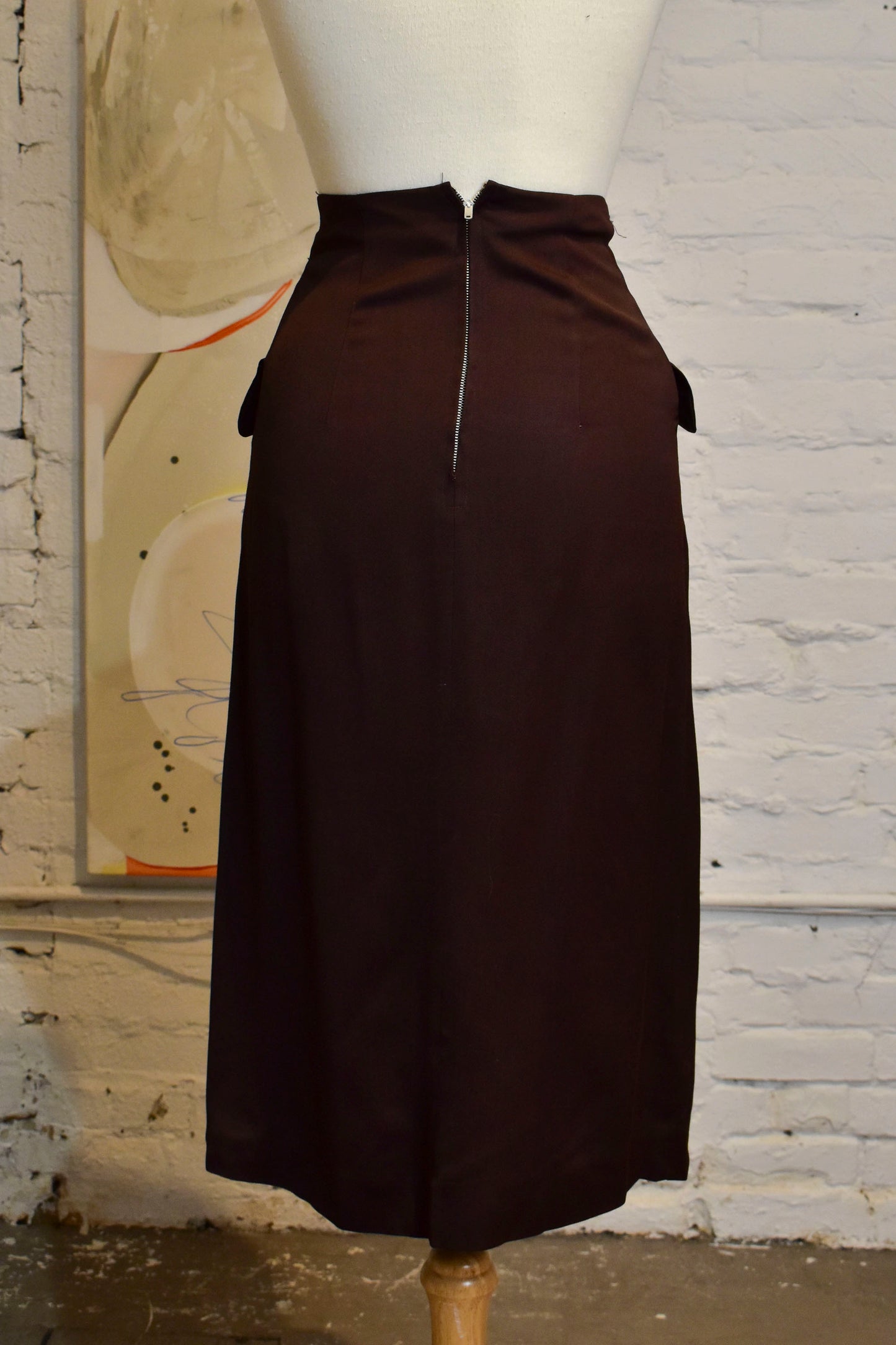 Vintage Brown Wool Pencil Skirt. High Waist. Two Pockets with Faux Button Detail. Unlined. Conmar Zipper Closure.