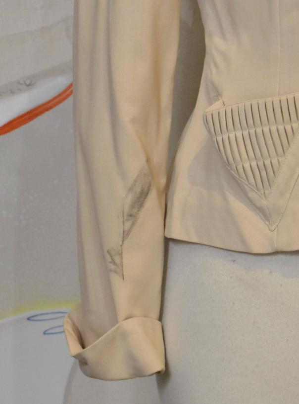 Vintage 1940s 1950s "Joan Miller Juniors" Cream Gabardine Blazer. Padded Shoulders. Pleating Shoulder and Pocket Details. Darted Waist. Button Closure Along Front. Unlined.