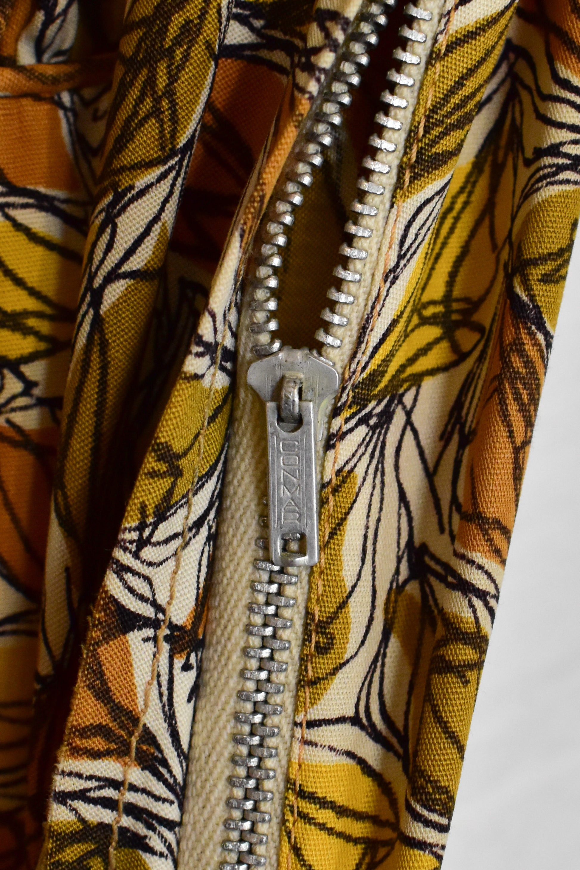 Vintage 50s Party Dress. Yellow Leaf Desgin with Rhinestone Bust. Circle Skirt. Conmark Side Zipper Closure. Unlined.