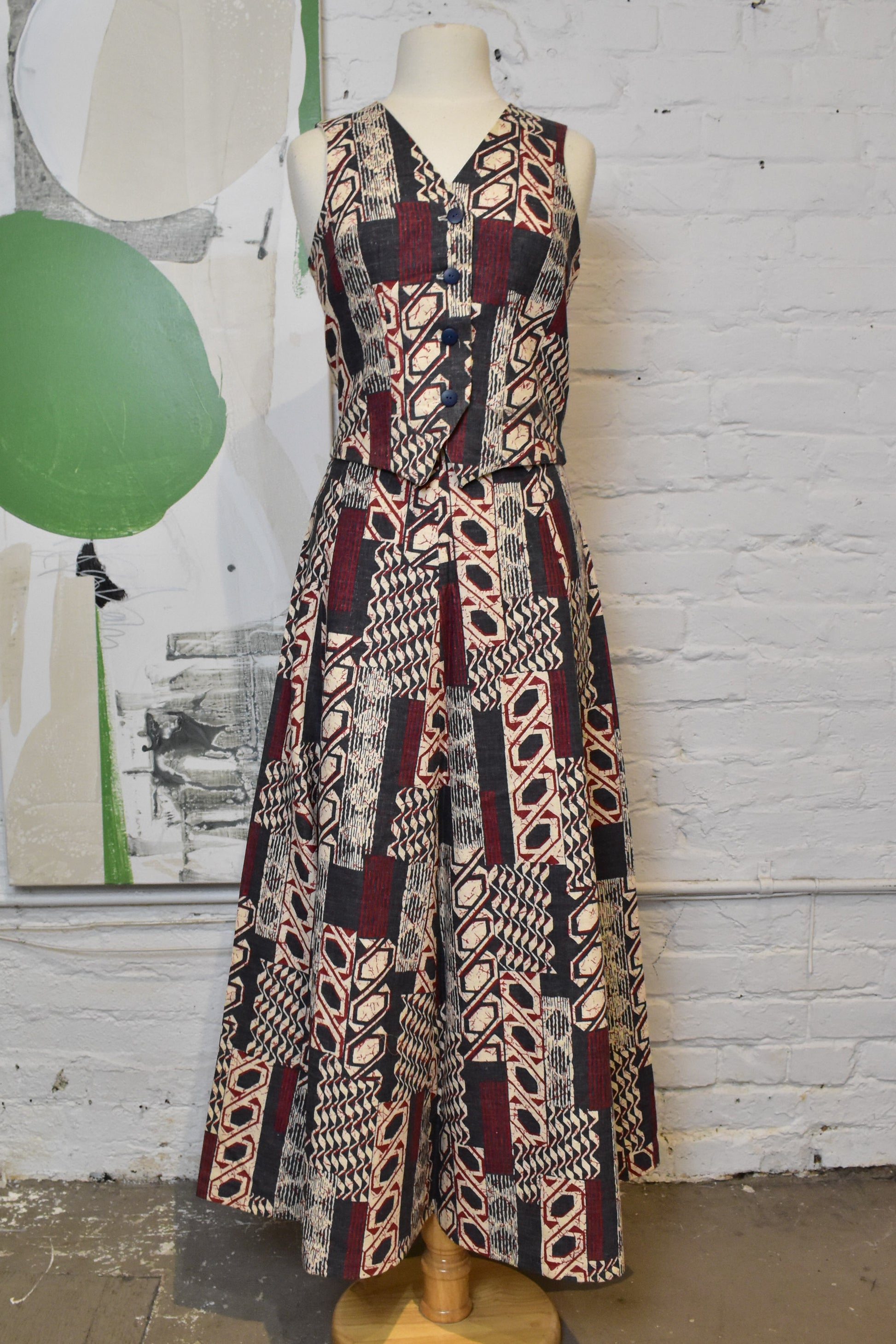 Vintage 1960s Batik 2 Piece Set. Vest Top with Darted Waist.Cotton Lined. Aline Maxi Skirt. Scovill Zipper Closure. Unlined.