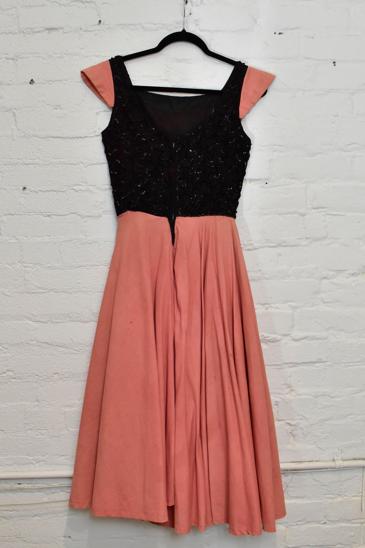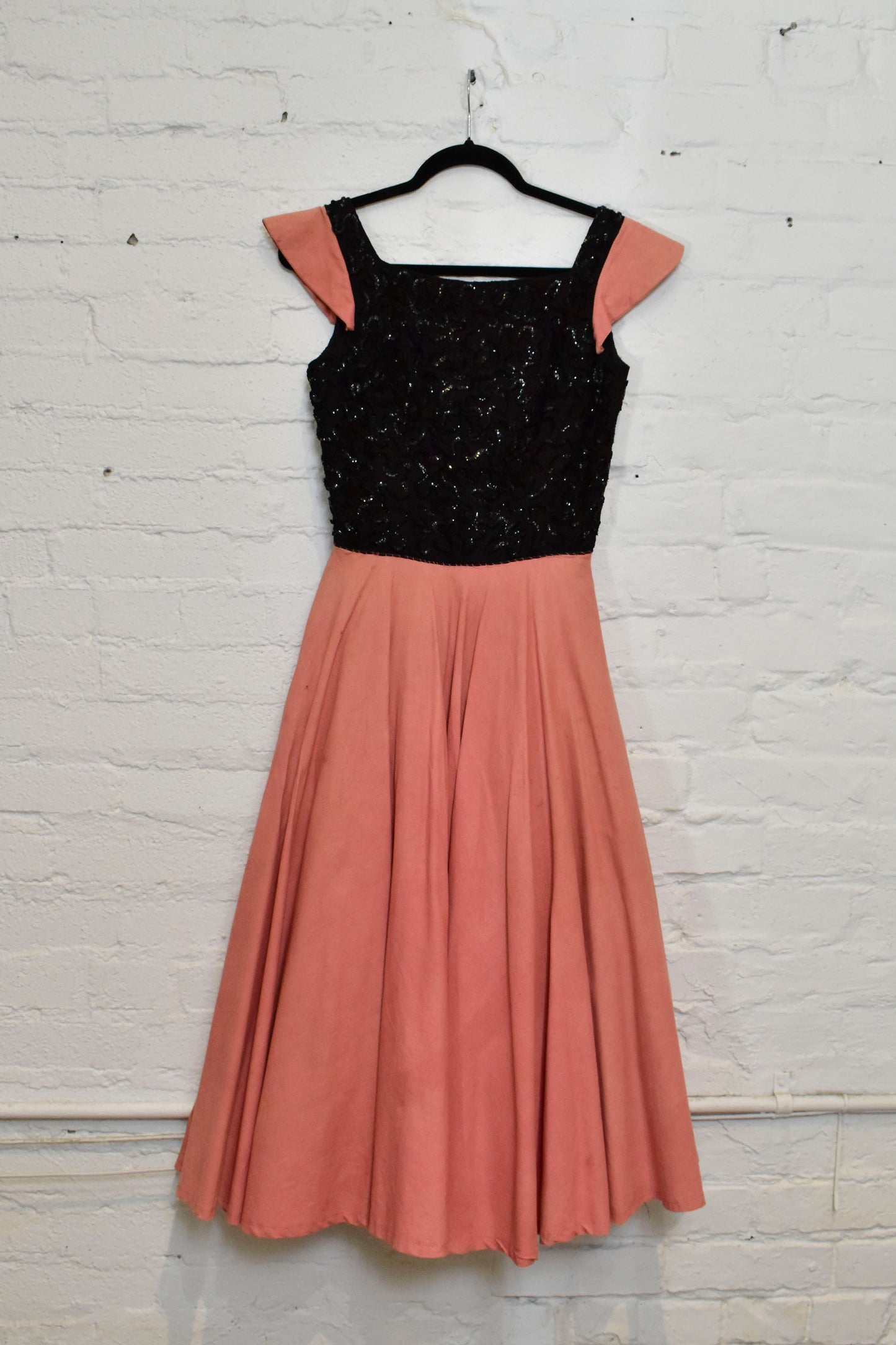 Zipper Closure. No Pockets. Sequin Bodice. Square Neck. Lined. Peach skirt and sleeves were added.
