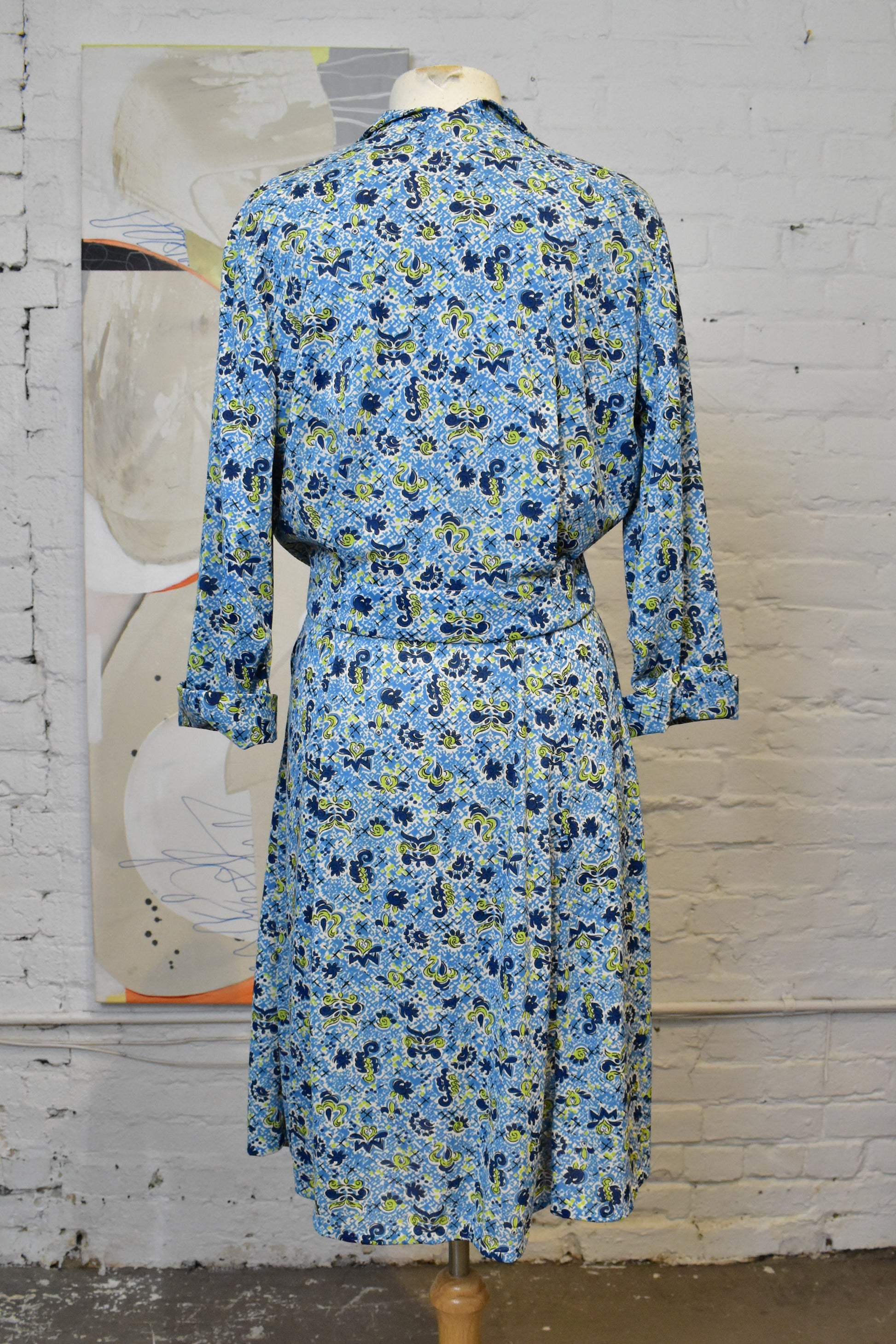 Vintage 1960s Blue Floral Nylon Dress and Jacket. Cropped Jacket Waist with Two Button Closure. Short Sleeved Dress with Sweetheart Neckline. Pleated Skirt. Side Zipper Closure. Unlined.
